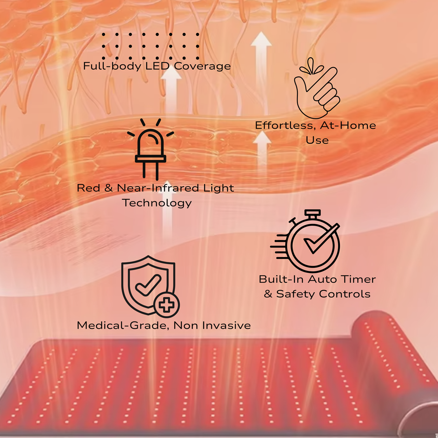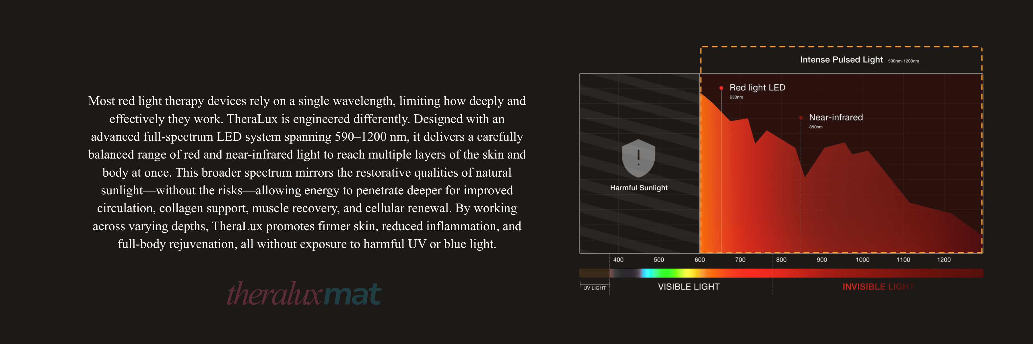 TheraLux Mat is powered by an advanced full-spectrum LED system that combines multiple red and near-infrared wavelengths into one unified therapy experience. Unlike traditional devices that focus on a single wavelength, TheraLux Mat delivers light energy across varying depths of the body, helping stimulate circulation, support collagen production, and promote cellular renewal. This multi-depth approach allows the body to absorb energy more efficiently, encouraging balanced, full-body rejuvenation without heat, UV, or blue light exposure.